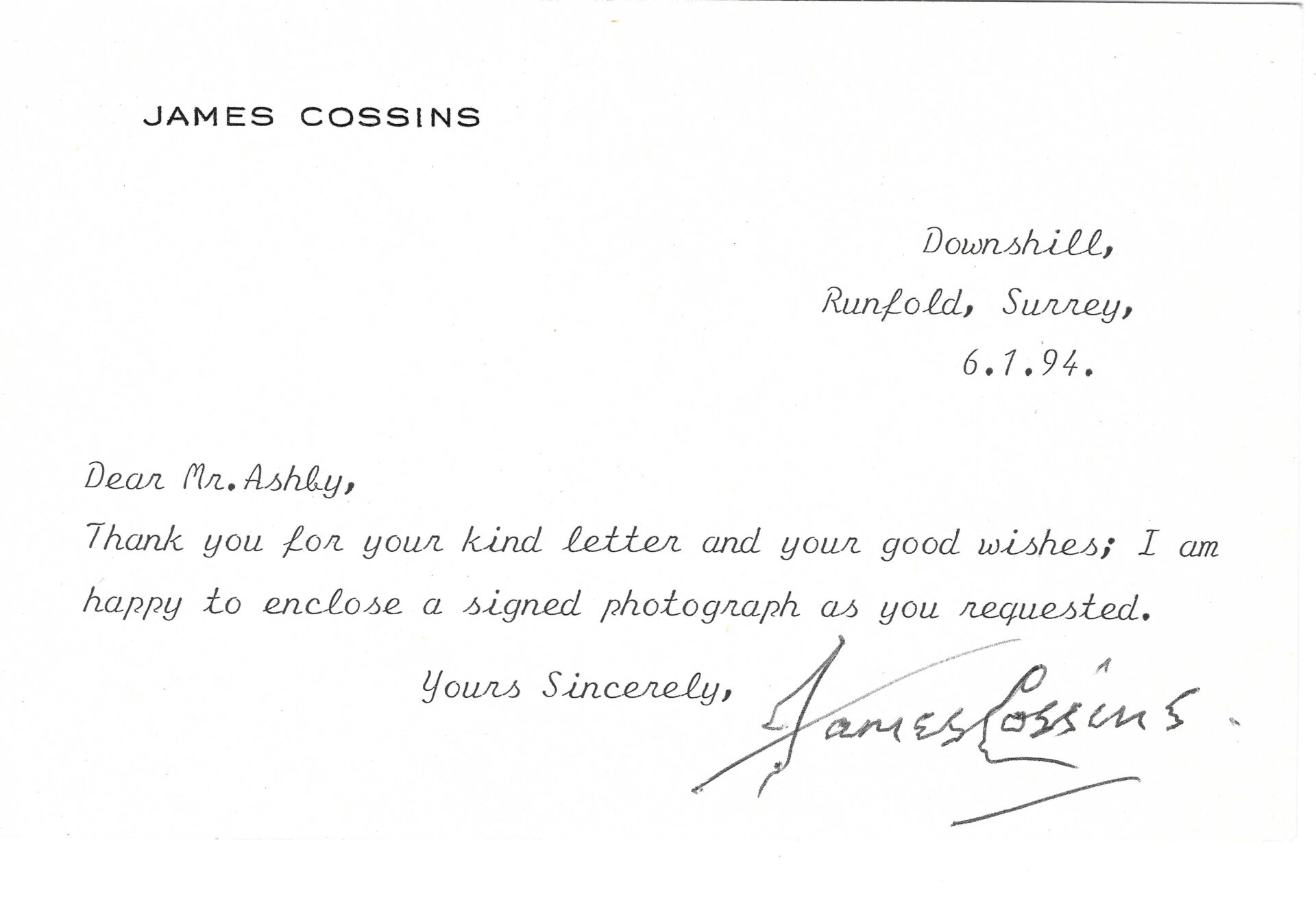 A typed postcard note hand signed by actor James Cossins, dated the 6th of January, 1991.