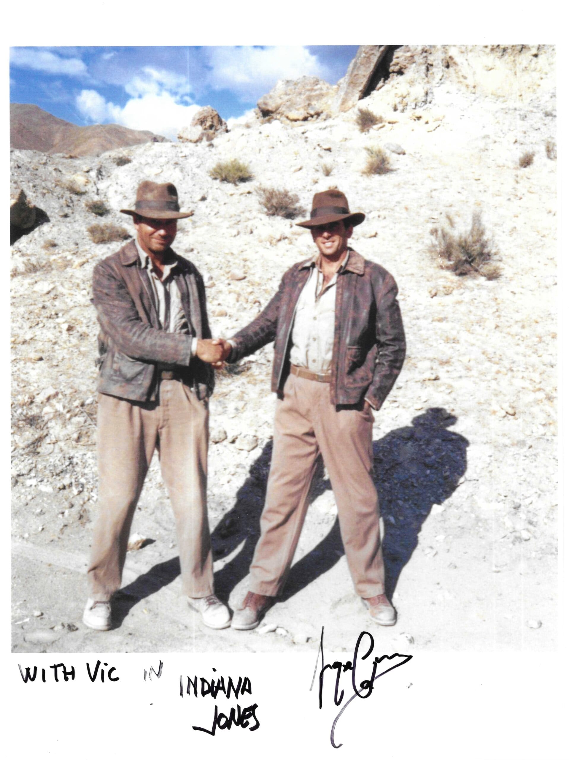 A rare 8×12 inch shot of stuntman Jordi Casares with Vic Armstrong in “Indiana Jones & The Last Crusade”, hand signed by Mr. Casares.